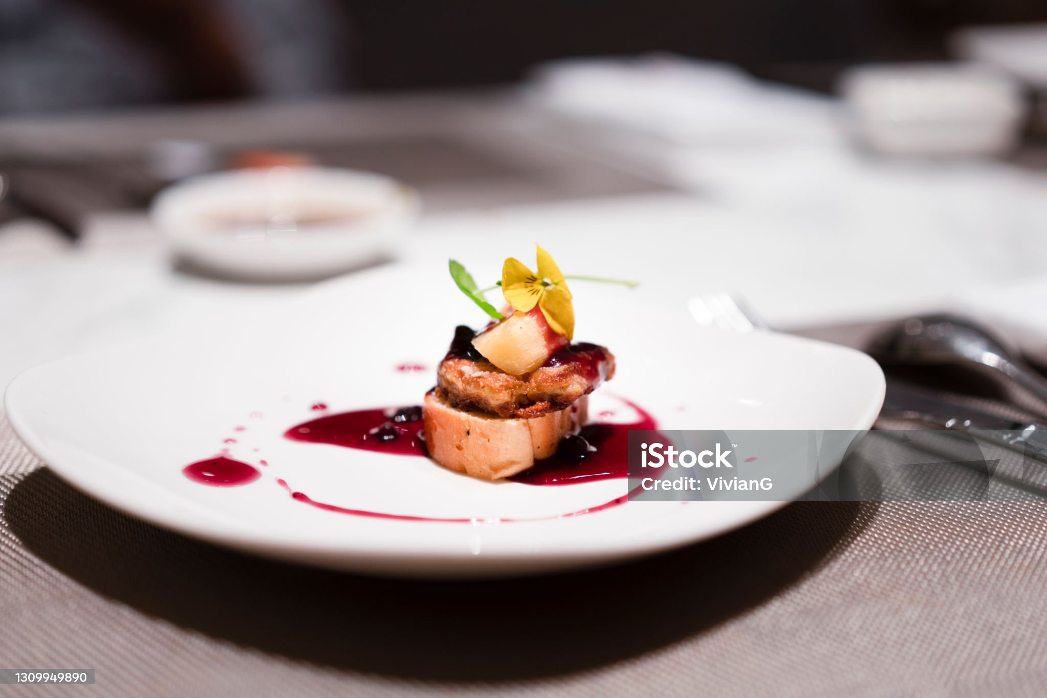 - 브리오슈 빵 위에 조리된 푸아그라를 올리고 소스를 곁들여 제공합니다.